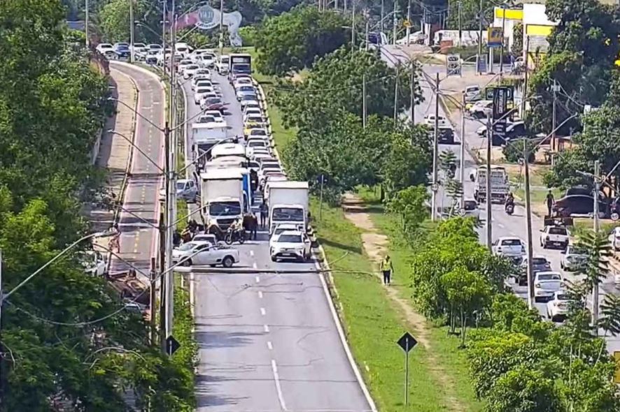 Um Peugeot 208 derrubou um poste e capotou na tarde desta segunda-feira (17) na Avenida Prefeito Murilo Domingos, em Várzea Grande. Imagens de uma câmera de monitoramento mostraram o congestionamento que se formou após o poste cair atravessado na via.
