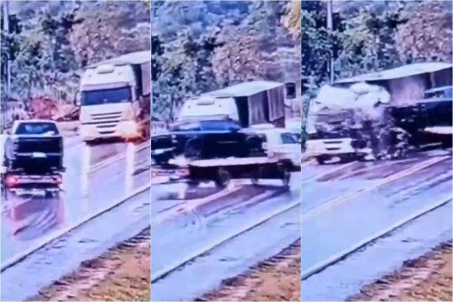 Conforme o registro, a pista estava molhada no momento do acidente e pelas imagens é possível ver o momento em que o guincho, que carregava uma caminhonete, invade a pista contrária e a colisão acontece.
