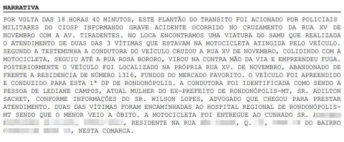 Esposa do ex-deputado federal Adilton Sachetti, a blogueira Lidiane Campos é suspeita de atropelar e matar uma criança de três anos na noite deste domingo (11), em Rondonópolis (220 km de Cuiabá).