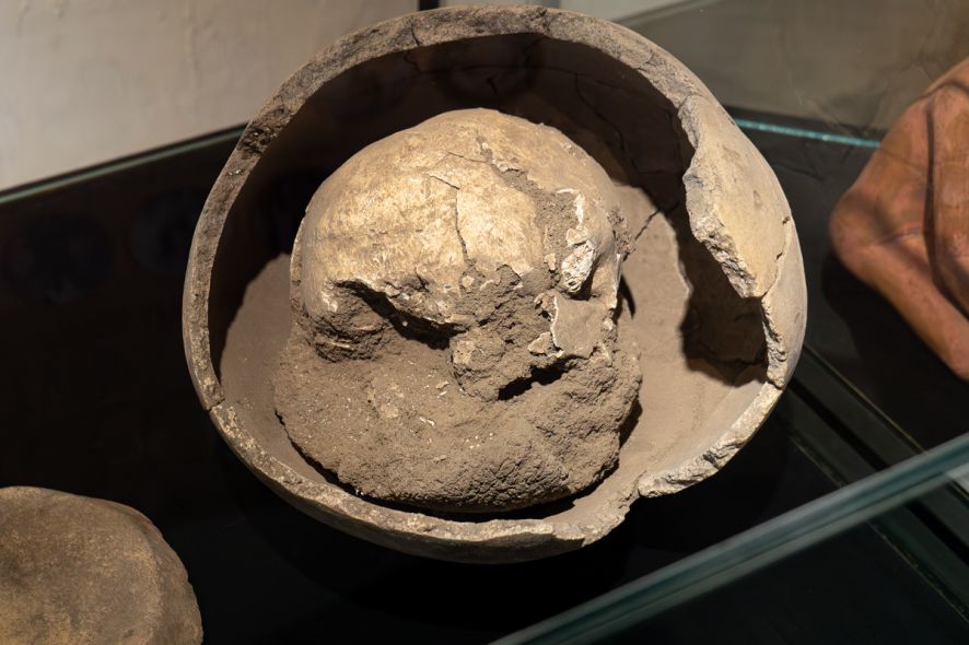 Outro achado citado foi o de um crânio enterrado dentro de uma antiga moradia, acondicionado em um recipiente, possivelmente ligado a rituais de memória e ancestralidade.