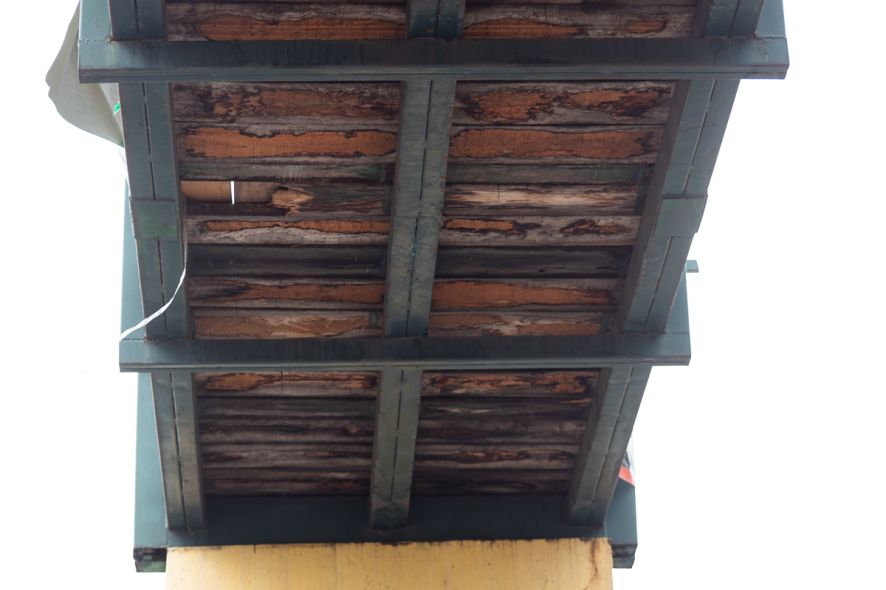 Ele é composto por madeira, que está visivelmente apodrecida. É possível ver que os degraus estão todos remendados devido à madeiras quebradas anteriormente.