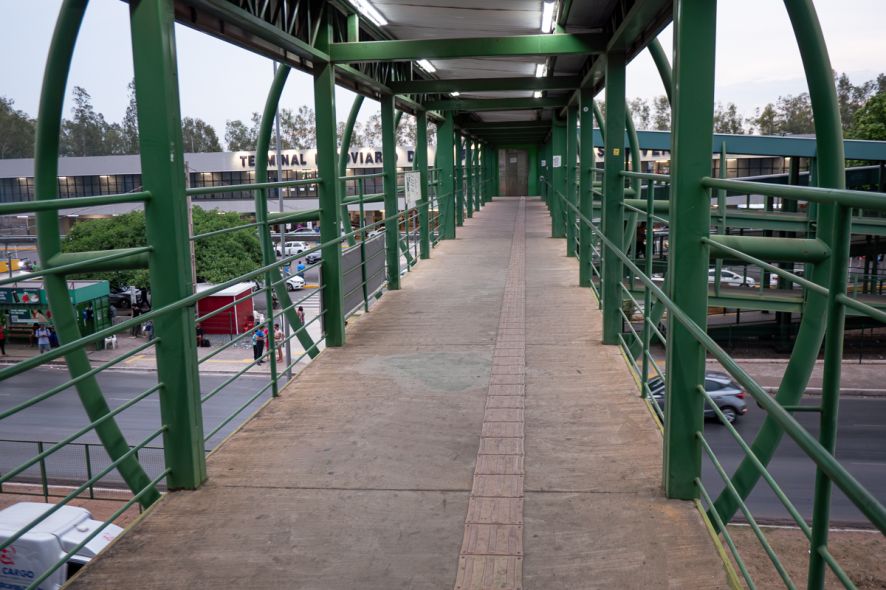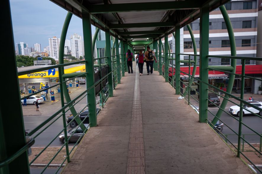 A passarela em frente à Rodoviária de Cuiabá é a estrutura com menos problemáticas observadas pela reportagem. Ela é constituída por rampas e há piso tátil para pessoas com deficiência visual.
