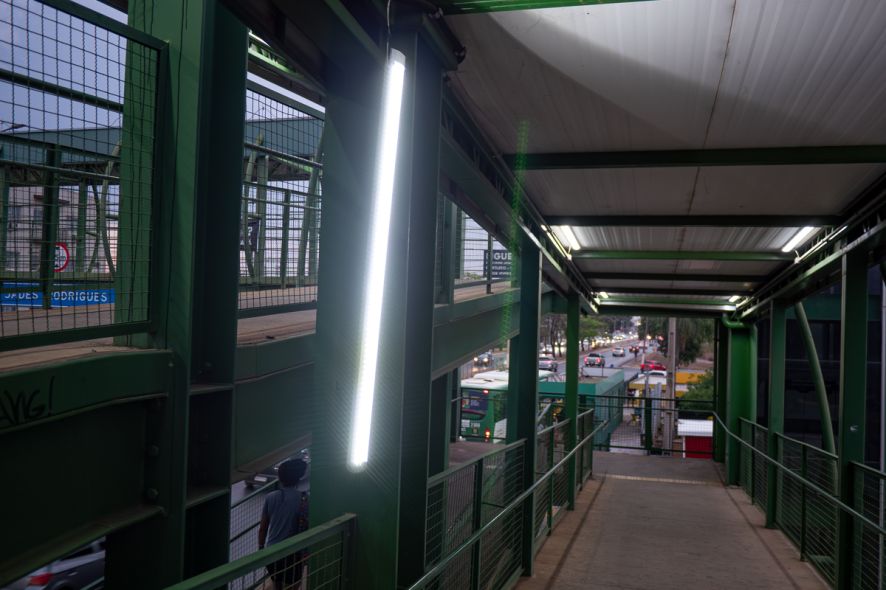 Lâmpada pendurada na passarela em frente à Rodoviária