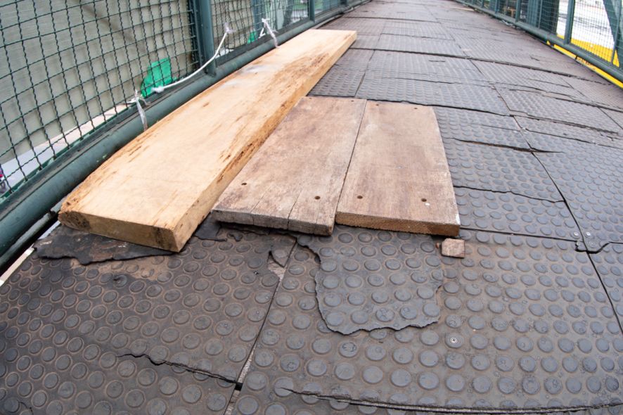 Eles foram cobertos por um tapete antiderrapante, mas além de ele não garantir maior segurança e apenas encobrir a madeira deteriorada, parte do tapete começou a sair e se desfazer, o que já causou acidentes.