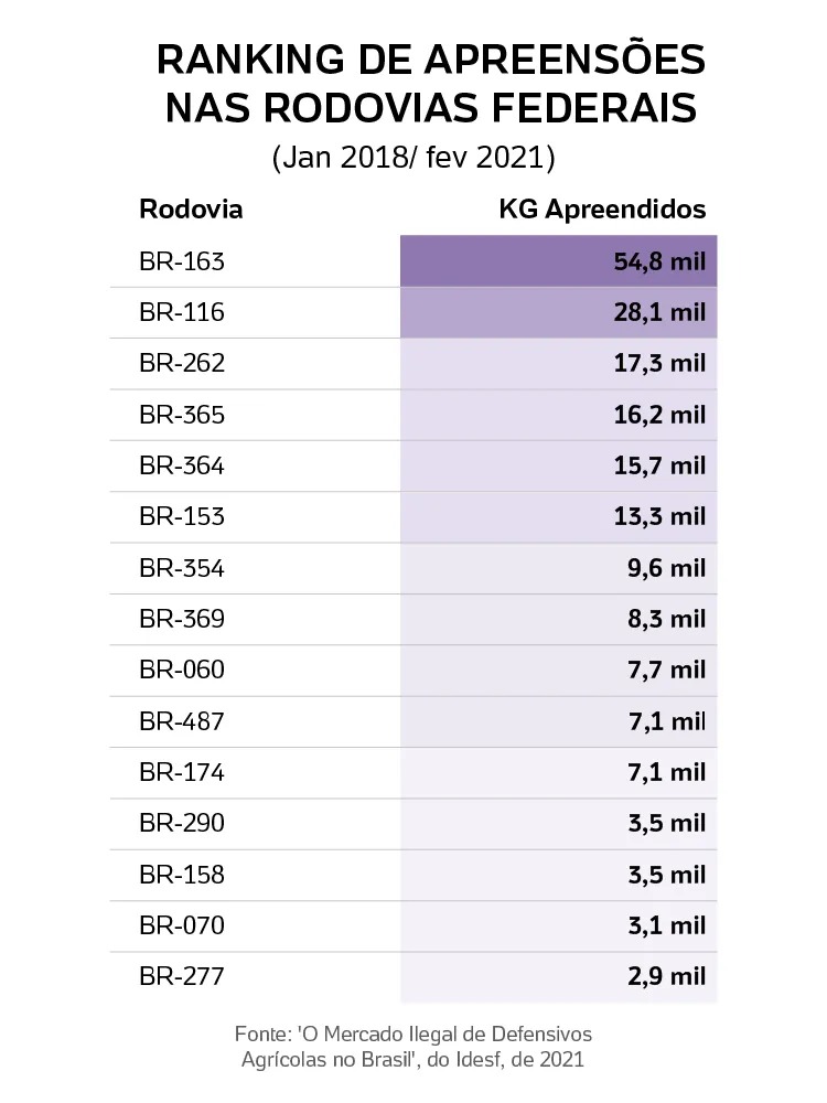 Rota do tráfego de agrotóxicos é via BR-163. Ali foram apreendidos 54,8 mil quilos de produtos pela Polícia Rodoviária Federal (PRF) entre 2018 e 2021, segundo o Idesf. As BRs 116 e 262 aparecem logo em seguida.