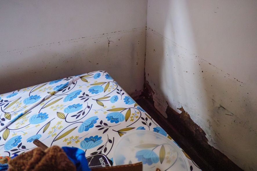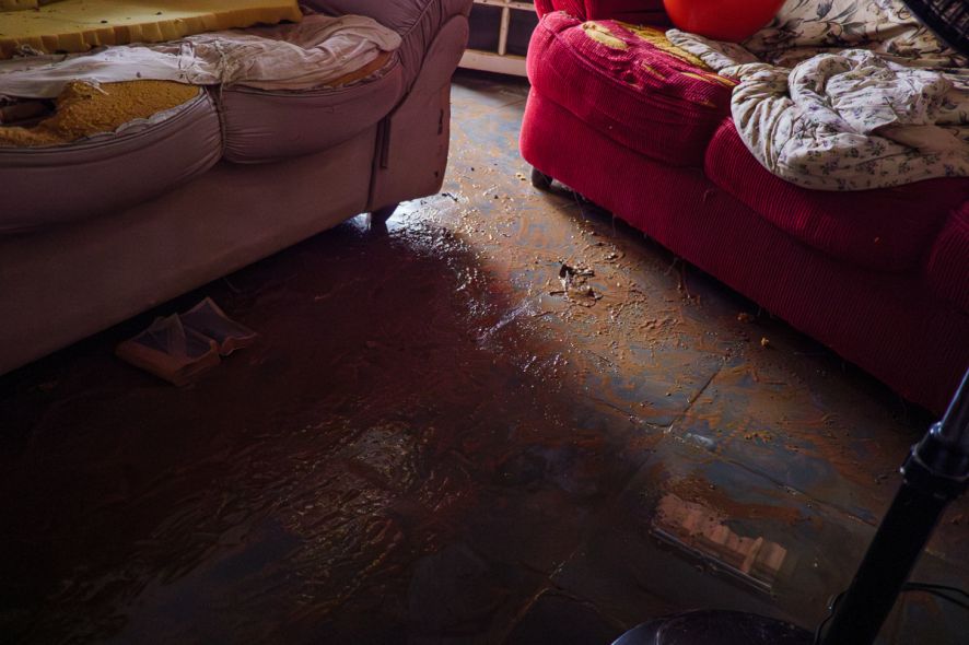 Para tentar se prevenir de uma possível enchente, ela construiu uma mureta na porta da cozinha. Contudo, o volume de água ultrapassou a barreira e deixou marcas de destruição pela casa.