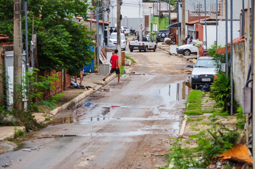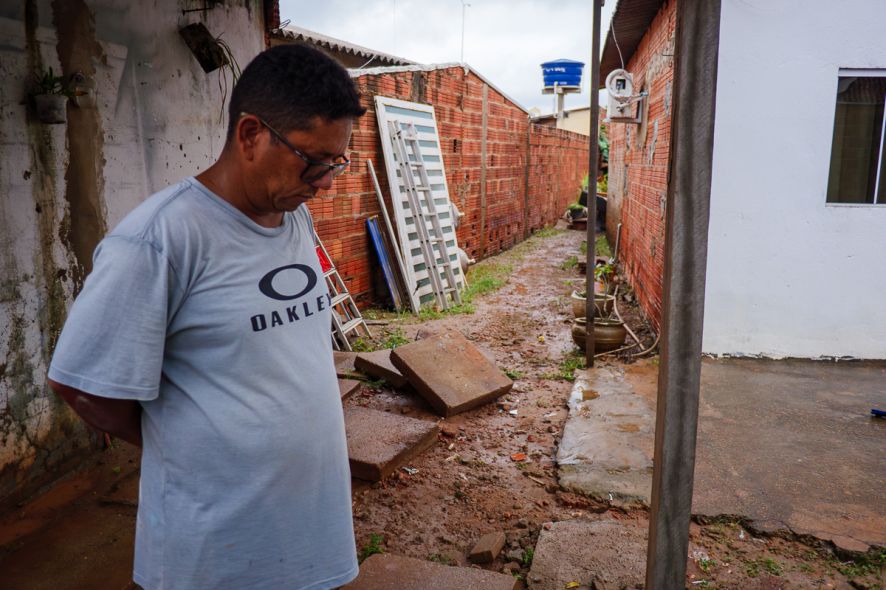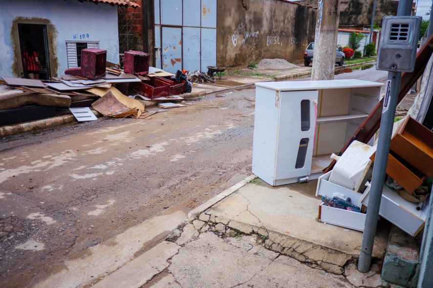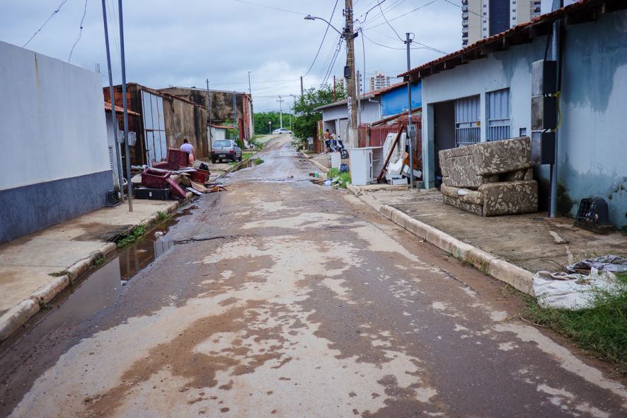 Horas após a chuva de 64 mm/h que atingiu Cuiabá, durante a tarde de terça-feira (8), moradores da Rua Rosário Oeste, no Bairro Pedregal, tentam se reorganizar e contabilizar os prejuízos.
