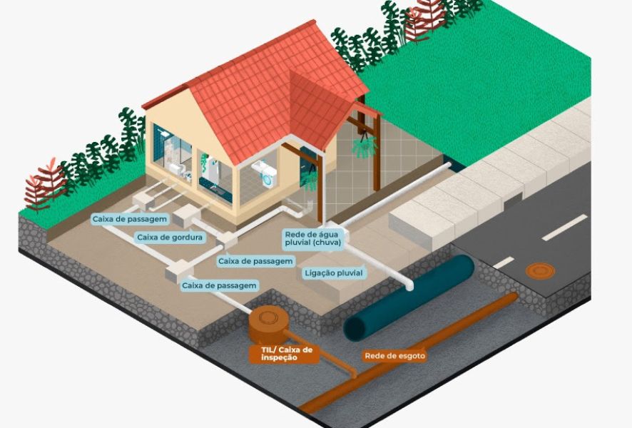 Já a rede de esgoto, operada pela concessionária, está conectada diretamente às casas por meio do Terminal de Inspeção e Limpeza (TIL) com tubulações menores, de plástico PVC. Durante o trajeto até o tratamento, os poços de visita – estruturas circulares com tampas metálicas visíveis nas ruas – permitem acesso para inspeção e manutenção.