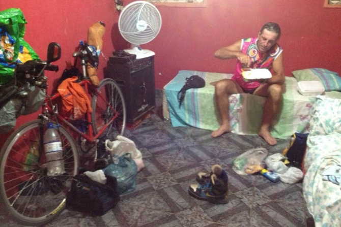 Com 30 kg divididos entre sua comida, o próprio peso da bicicleta e a barraca – único local que tem dormido no caminho – Graton cruzou a baía do Rio Negro, passou pela BR 319, que liga Manaus a Rondônia e fica embrenhada na Floresta Amazônica, e chegou a Cuiabá nesta semana.