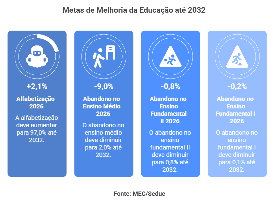 Tudo isso faz parte de uma política pública que envolve outros componentes e que já vem mostrando resultado. O Programa Educação 10 Anos reúne uma série de iniciativas para que, em 2032, o estado tenha índices melhores que há dez anos antes, em 2022, no Ideb (Índice de Desenvolvimento da Educação Básica), na alfabetização e na evasão escolar. Veja o gráfico abaixo: