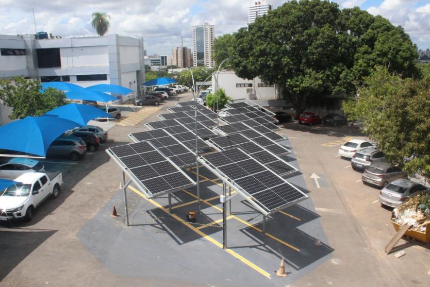 Para abrigar as placas, foi feita uma estrutura metálica que também servirá como estacionamento coberto para os servidores públicos.