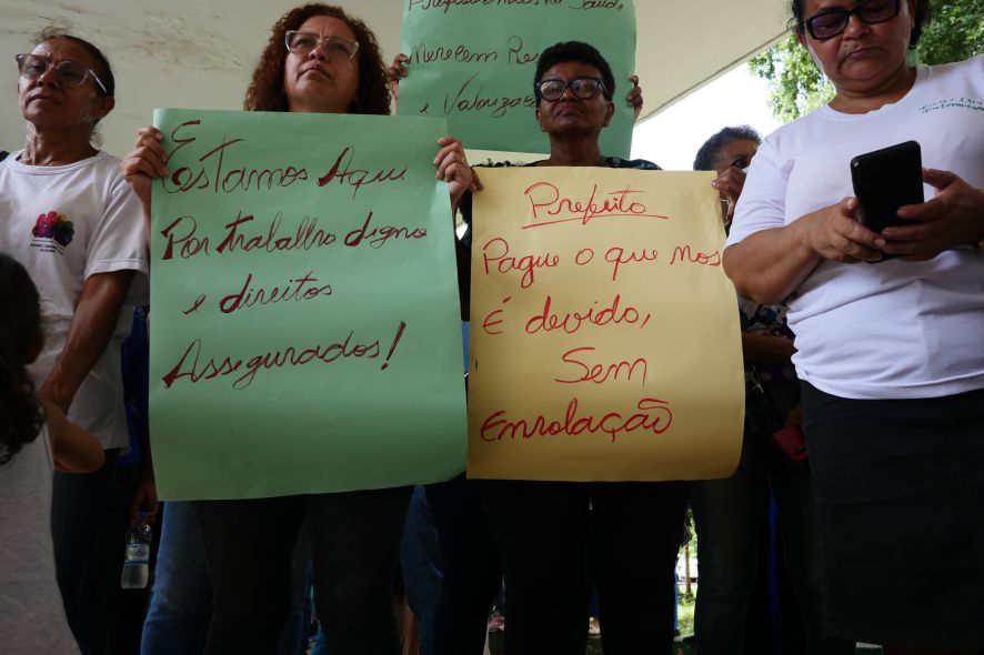 Os manifestantes foram até o Palácio Alencastro segurando faixas pedindo o pagamento da remuneração. “Respeito começa com salário em dia”, dizia um dos cartazes.