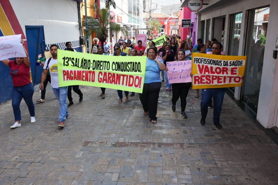 Servidores da Saúde percorrem ruas do Centro reivindicando pagamento de remuneração