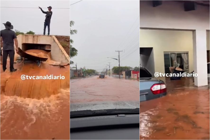 Um forte temporal atingiu a cidade de Pontes e Lacerda (444,6 km de Cuiabá) e inundou ruas, casas e comércios na madrugada desta quarta-feira (29). Vídeos com a enchente circularam nas redes sociais.