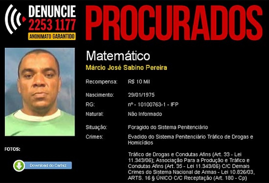 Desde o ultimo o ultimo dia 24 a recompense pela captura de Matemático havia aumentado de R$ 3.000 para R$ 10 mil. O traficante possui nove mandados de prisão pelos crimes de tráfico de drogas, associação para o tráfico e formação de quadrilha.