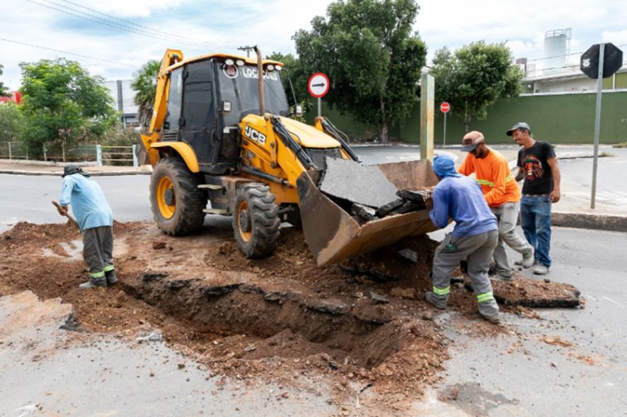 A Secretaria Municipal de Infraestrutura e Obras Públicas também atua na recuperação de um buraco na pista, localizado a alguns metros da ponte. Com o apoio de maquinários, a equipe verifica as causas do problema para adotar as medidas necessárias.