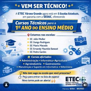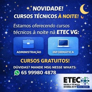 A Escola Técnica Estadual de Várzea Grande (ETEC-VG) está com matrículas abertas e prorrogadas até o Carnaval para os cursos técnicos gratuitos de Administração e Informática, na modalidade subsequente.