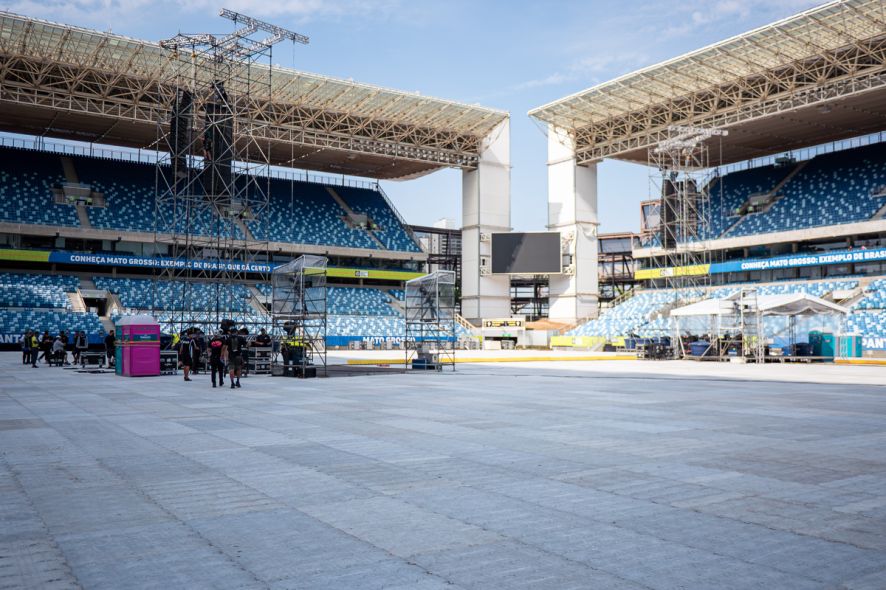 Para proteger o gramado da Arena Pantanal, uma cobertura especial já foi instalada. Esse procedimento é uma exigência da administração do local e segue protocolos estabelecidos para eventos de grande porte.