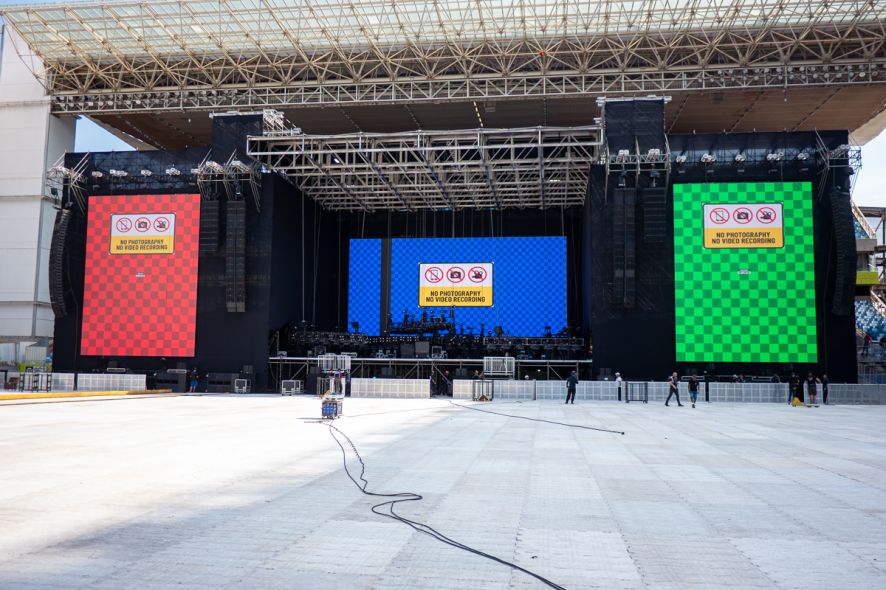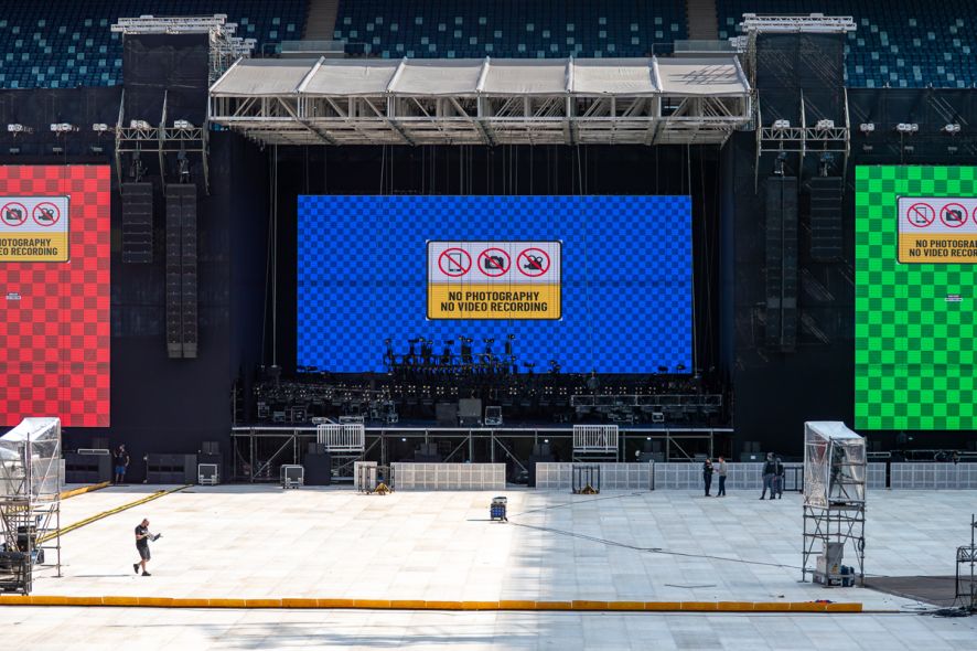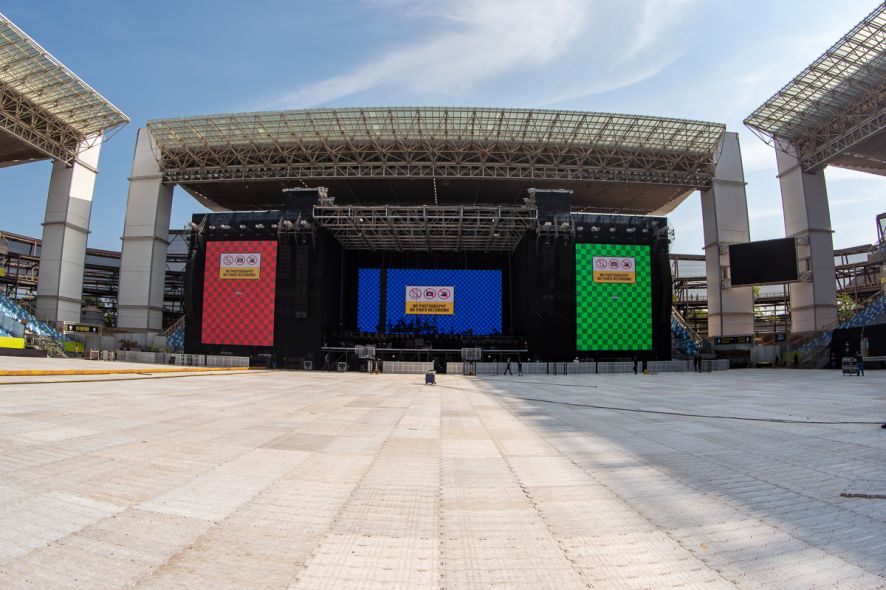 O palco principal, que será o centro das atenções, já está totalmente montado e passou por testes de som e iluminação durante a tarde. Toda a operação é supervisionada pela equipe técnica da própria banda, que acompanha de perto cada detalhe para manter o alto padrão das apresentações.