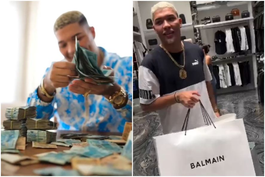 Nas imagens, que parecem um meio de divulgação da vida do influencer, ele aparece com montantes de dinheiro em espécie, se mostra com joias e bebidas caras, além de viagens e passeios em carros de luxo.