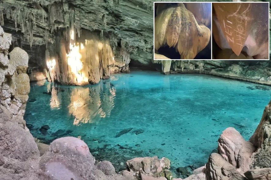 Imagens feitas na gruta mostram pichações antigas, e outras nem tanto, e gravações esculpidas nas formações rochosas. “Havia lugares com estalactites e estalagmites [formações rochosas] de centenas de anos que, de tanto a pessoa passar e colocar a mão, foram desaparecendo, foram se quebrando”, afirma Carla.