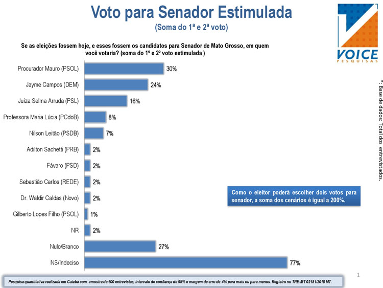 O instituto Voice Pesquisas realizou um estudo sobre o cenário das eleições ao Senado em Cuiabá, maior colégio eleitoral de Mato Grosso. Neste pleito, os eleitores poderão eleger dois candidatos.