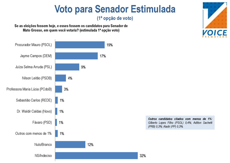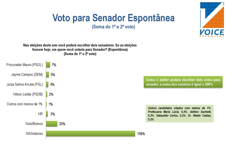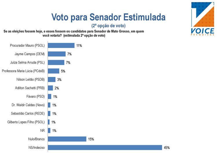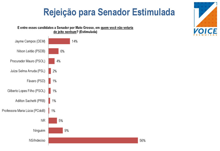 O Voice também mediu a rejeição entre os candidatos ao Senado. Jaime Campos foi o mais rejeitado, com 15%; seguido por Nilson Leitão, com 6%; Procurador Mauro, com 4%; Selma Arruda, com 2%; Carlos Fávaro, com 1%; Gilberto Lopes, com 1%; Adilton Sachetti, com 1%; e Maria Lúcia Neder, com 1%.