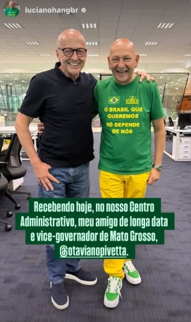 O vice-governador Otaviano Pivetta (Republicanos) se encontrou neste sábado (3) com o dono das lojas Havan, empresário Luciano Hang, em Santa Catarina.