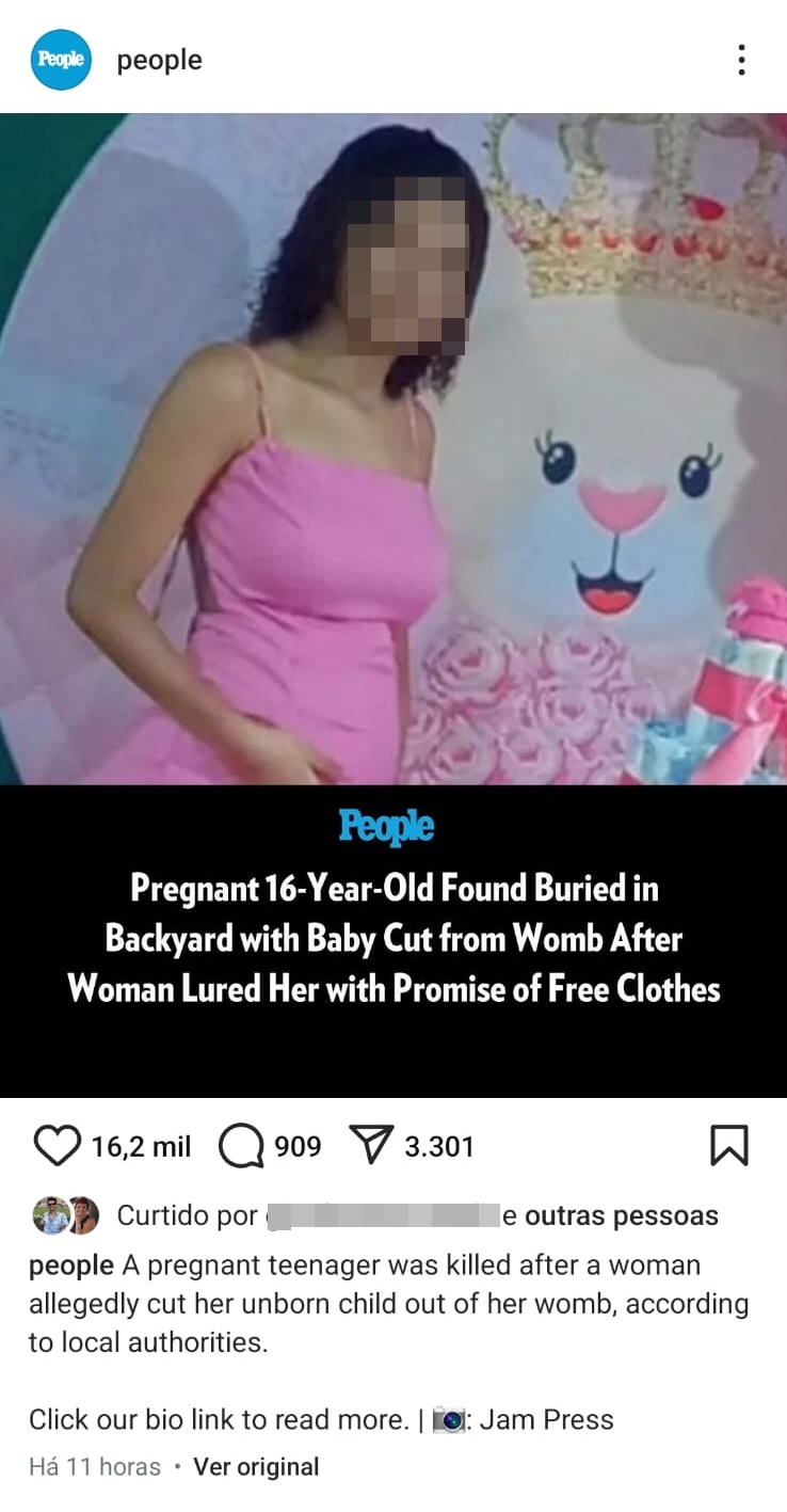 "Uma adolescente grávida foi morta depois que uma mulher supostamente cortou seu filho ainda não nascido do útero, de acordo com autoridades locais", destacou a revista.