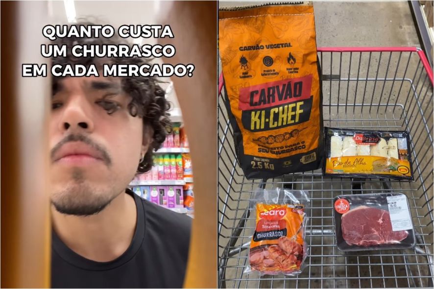 No vídeo, o influenciador mostra que visitou cinco estabelecimentos e comparou o preço da carne alcatra, da linguiça, do pão de alho e do carvão.