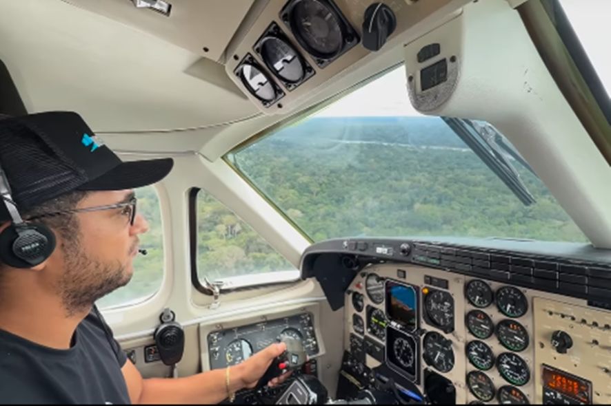As imagens mostram parte do voo e o momento em que o Beechcraft King Air C90, pilotado pelo próprio artista, toca o solo com segurança em uma pista às margens do rio.