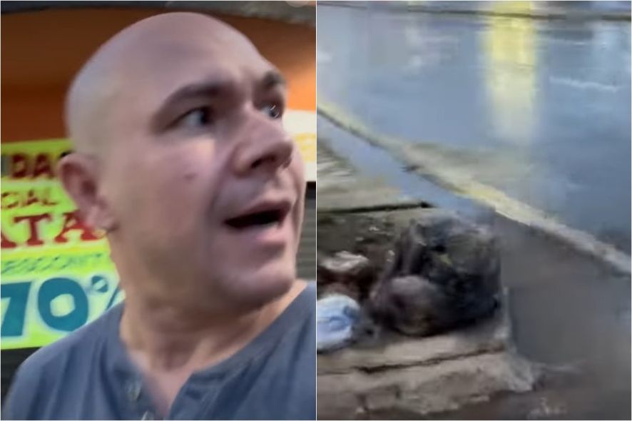 “Da onde que vem o lixo? Dos próprios lojistas. Põe uma cesta aqui, coloca um negócio para guardar o lixo. Olha, aí vem a chuva, leva todo esse lixo pra boca de lobo, e a situação é essa. O problema é a falta de educação”, afirmou para a população.