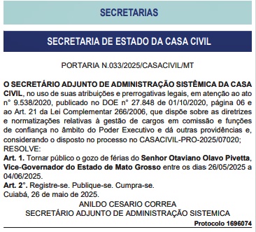 O vice-governador Otaviano Pivetta (Republicanos) entrou em um breve período de férias. Segundo publicação do Diário Oficial do Estado, ele fica fora do Paiaguás entre os dias 26 de maio a 04 de junho.
