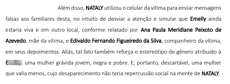 Segundo o documento, a Nataly enviou “mensagens falsas aos familiares da [adolescente], no intuito de desviar a atenção e simular que ela ainda estaria viva e em outro local.”