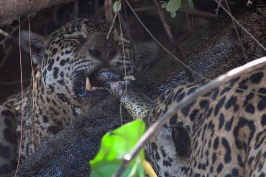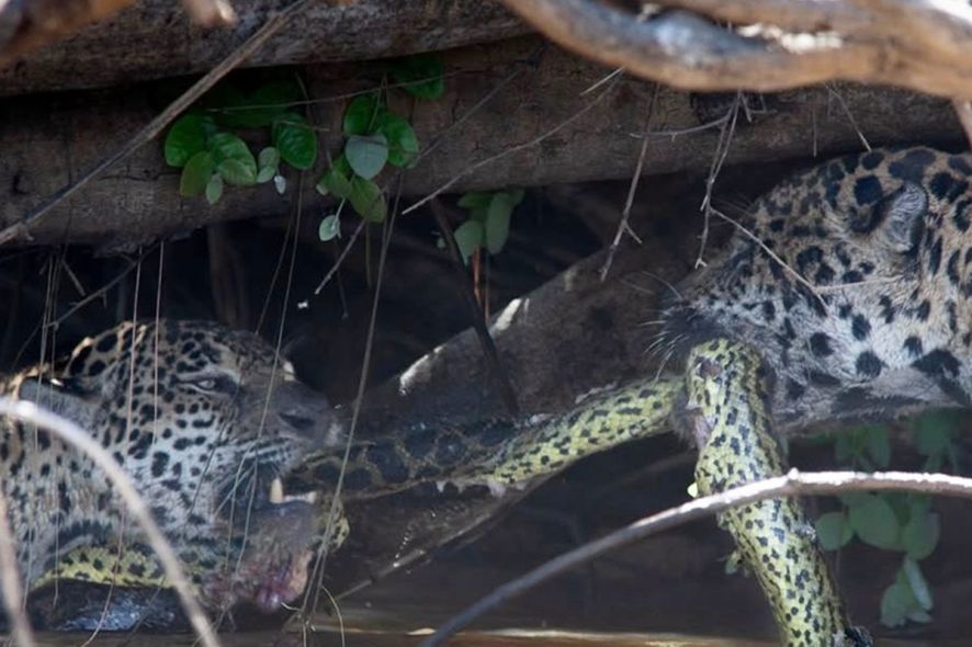 As onças encontraram a cobra após um período de acasalamento de cinco dias. O embate durou mais de duas horas. A fêmea puxou a cabeça da sucuri enquanto o macho segurava a cauda. A disputa terminou quando a cobra se partiu ao meio.