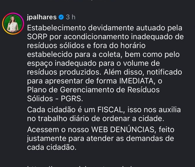 A secretária Municipal de Ordem Pública, Juliana Palhares, também comentou na publicação e afirmou que o restaurante foi notificado por acondicionamento inadequado de resíduos sólidos e fora do horário estabelecido para a coleta.