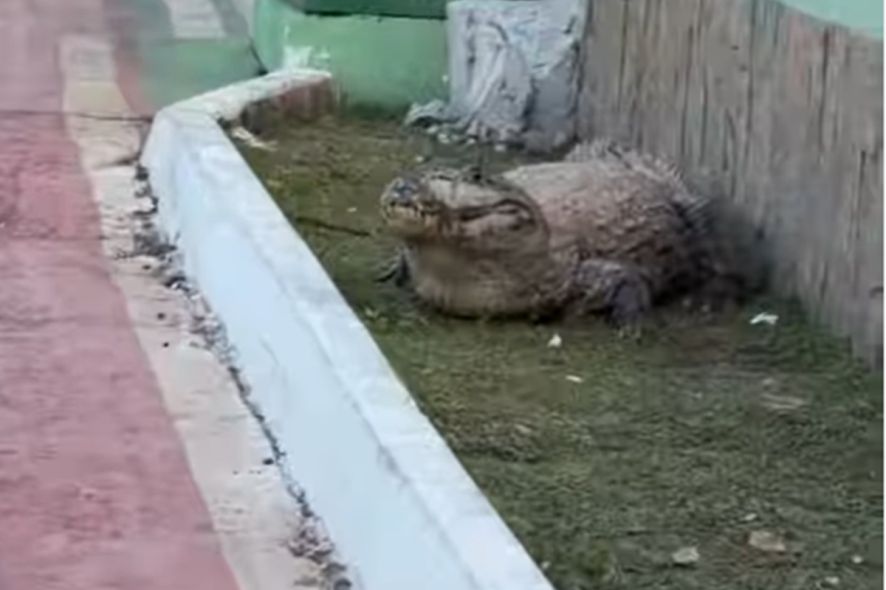 Uma mulher que andava distraída chega a passar ao lado do jacaré e se assusta com o animal, mas ele permanece imóvel.