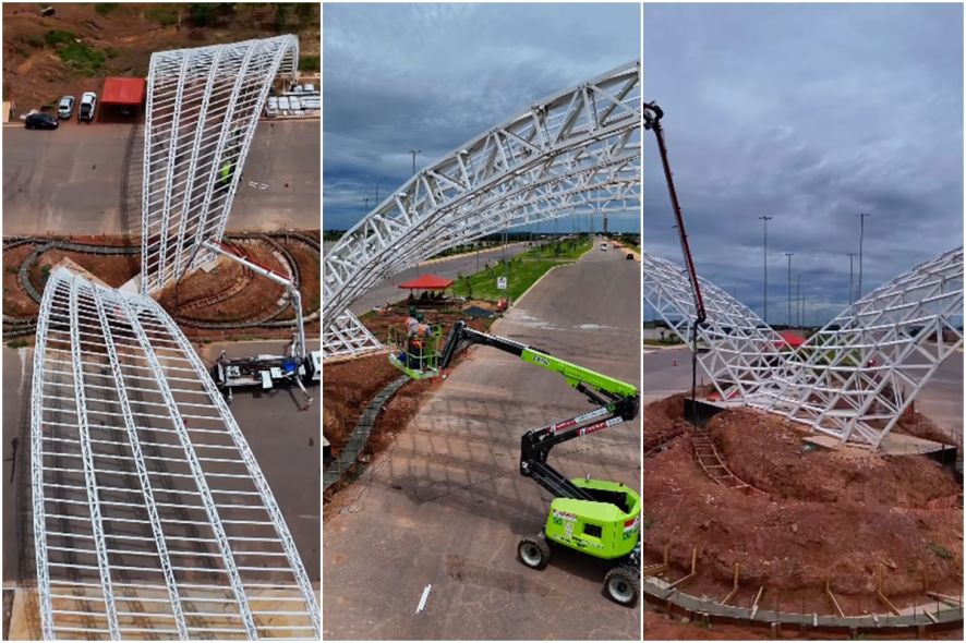 As obras do Parque Novo Mato Grosso avançam com a instalação da estrutura que servirá como porta de entrada para o espaço. Com 58,53 m² de área coberta e 289,74 m² de paisagismo, o pórtico de acesso foi inspirado no voo do tuiuiú, ave-símbolo do Estado, e une traços futuristas à valorização da biodiversidade regional.