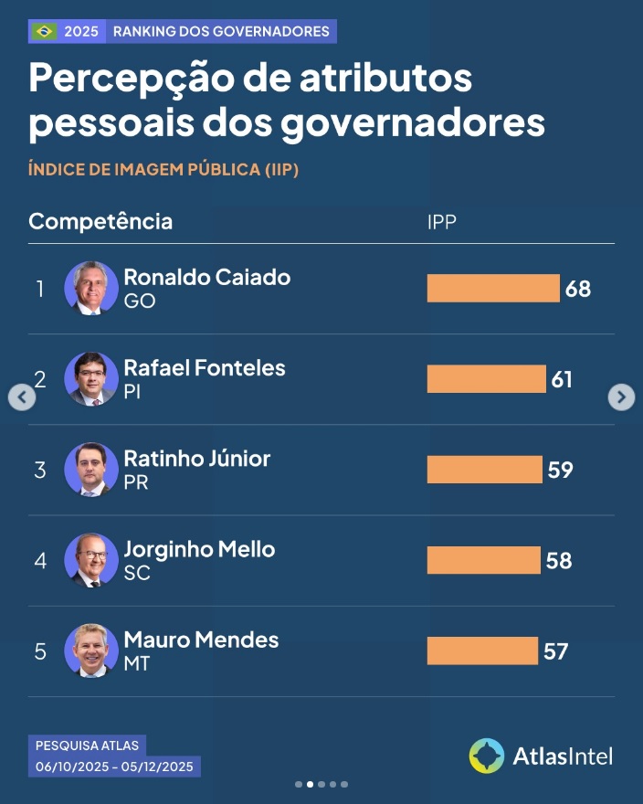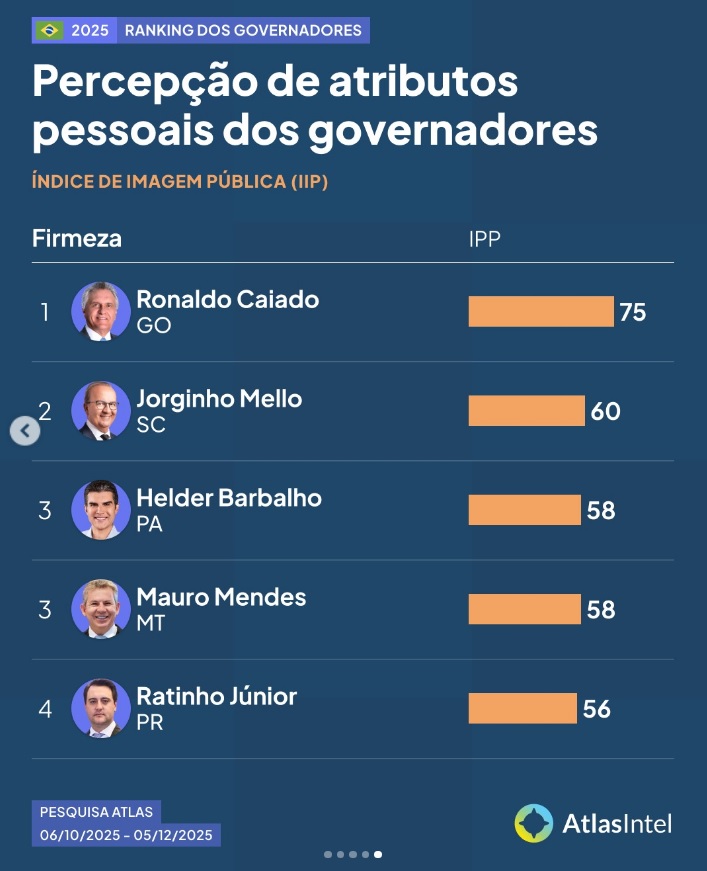 A AtlasIntel mediu a percepção de atributos pessoais dos governadores, em que trata sobre carisma; competência; compromisso com o povo; liderança; e firmeza.