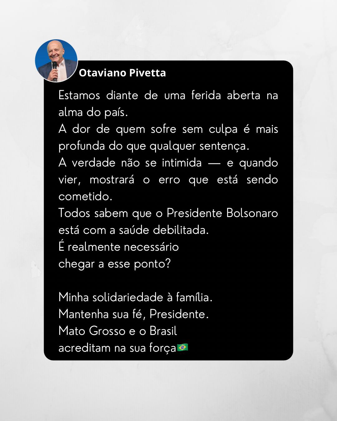 “Mantenha sua fé, presidente. Mato Grosso e o Brasil acreditam na sua força.”