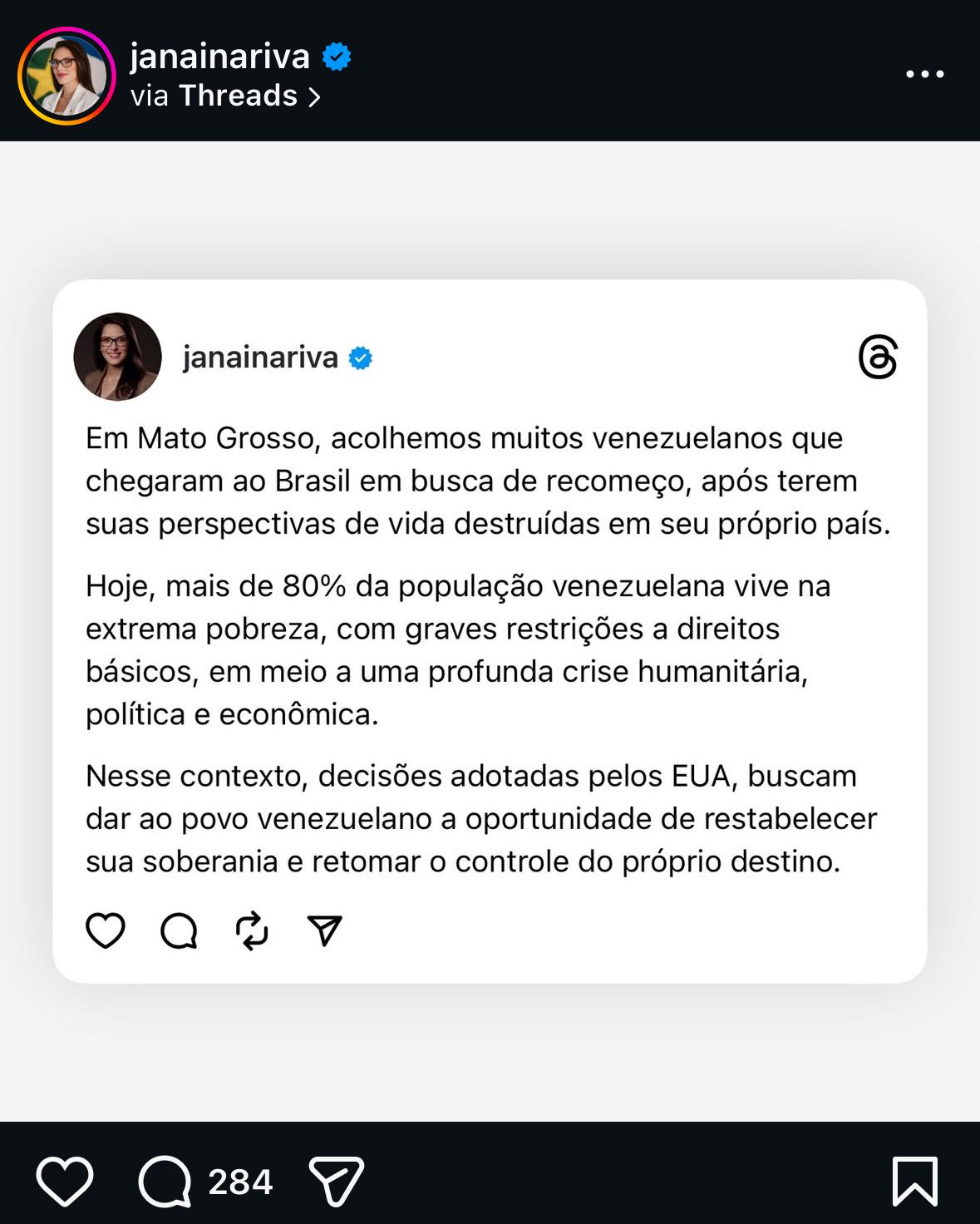 O prefeito de Cuiabá, Abilio Brunini (PL), cobrou publicamente a deputada estadual Janaina Riva (MDB) após a parlamentar elogiar, em publicação nas redes sociais, a ação dos Estados Unidos contra o presidente da Venezuela, Nicolas Maduro.