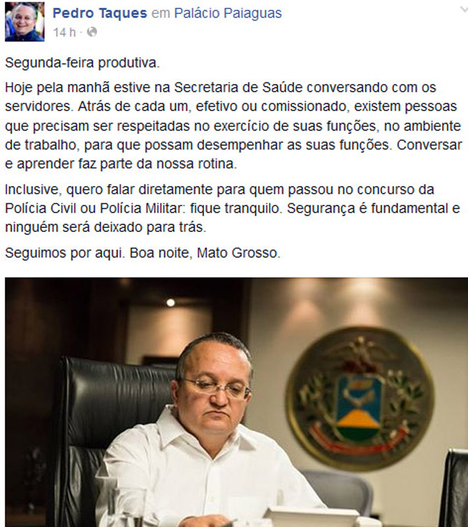 Confira o post do governador Pedro Taques no Facebook: