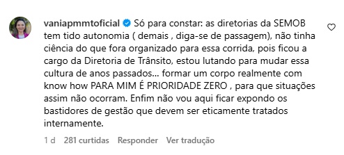 “A declarar, as diretorias da Semob têm tido autonomia (demais, diga-se de passagem), não tinha ciência do que foi organizado para essa corrida, pois ficou a cargo da Diretoria de Trânsito. Estou lutando para mudar essa cultura de anos passados”, escreveu a secretária em um comentário.