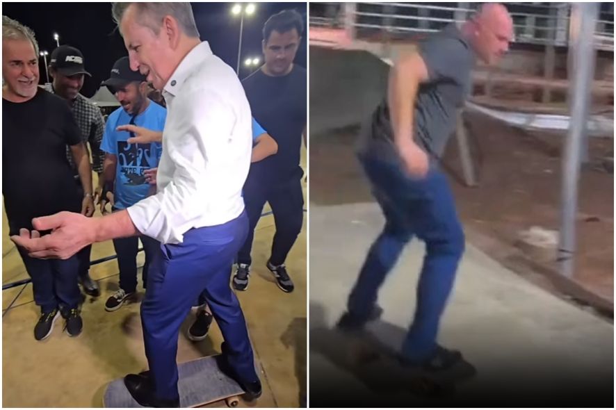 O governador Mauro Mendes (União) e o prefeito de Cuiabá Abilio Brunini (PL) se arriscaram no skate durante a inauguração da Arena Skate Plaza, no Parque Novo Mato Grosso, na noite de quarta-feira (17).