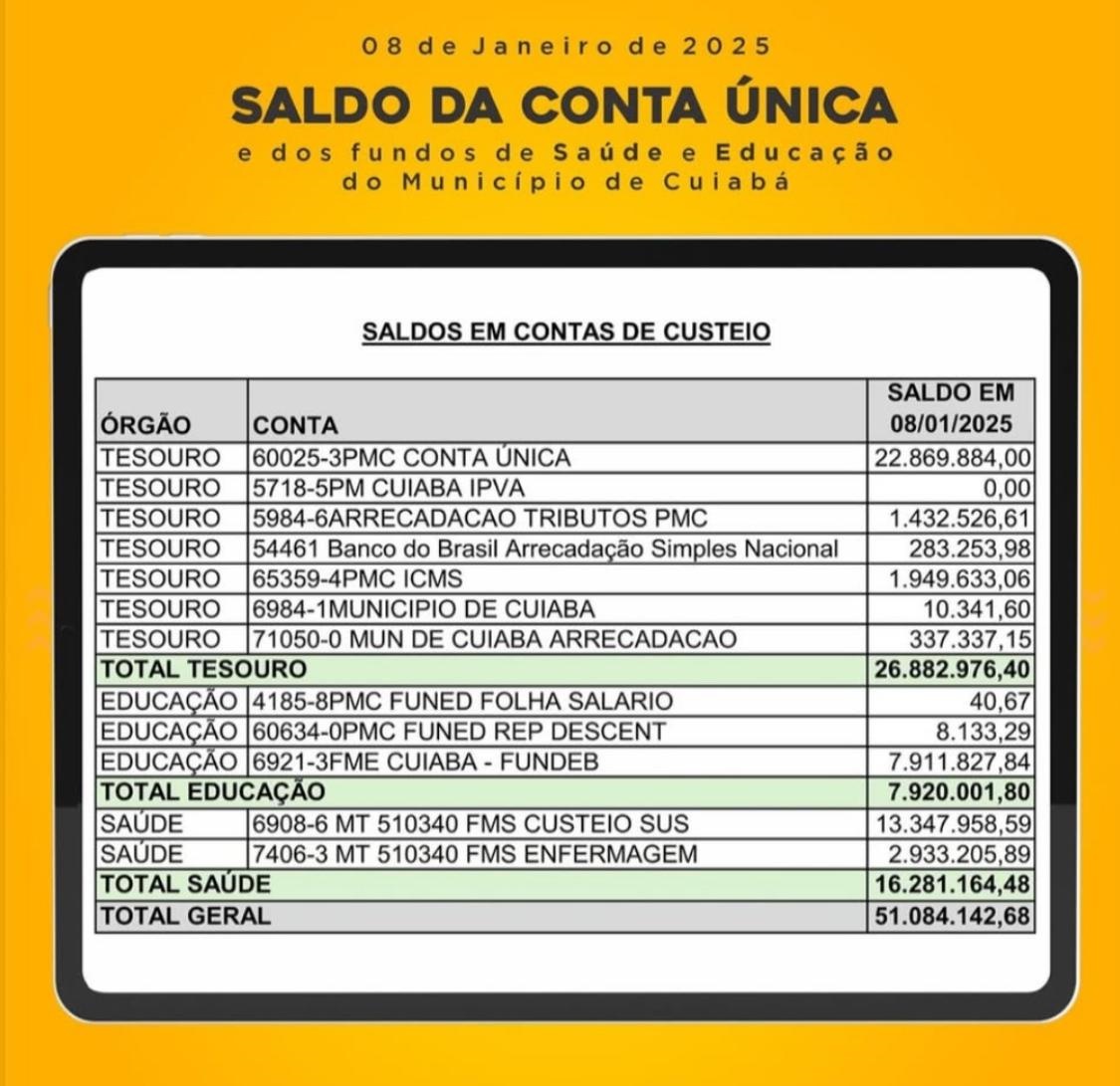 Numa demonstração de transparência, o prefeito Abilio Brunini (PL) vem publicando no Instagram o extrato da Conta Única da Prefeitura - algo inimaginável até o último dia 31 de dezembro.