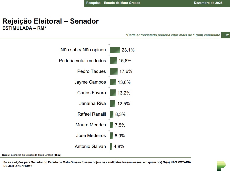 Na sequência aparecem: a deputada Janaina Riva (MDB), com 12,5% de rejeição; o vereador de Cuiabá Rafael Ranalli (PL), com 8,3%; o governador Mauro Mendes (União), com 7,5%; o deputado federal José Medeiros (PL), com 6,9%; e o agricultor Antônio Galvan (DC), com 4,8%