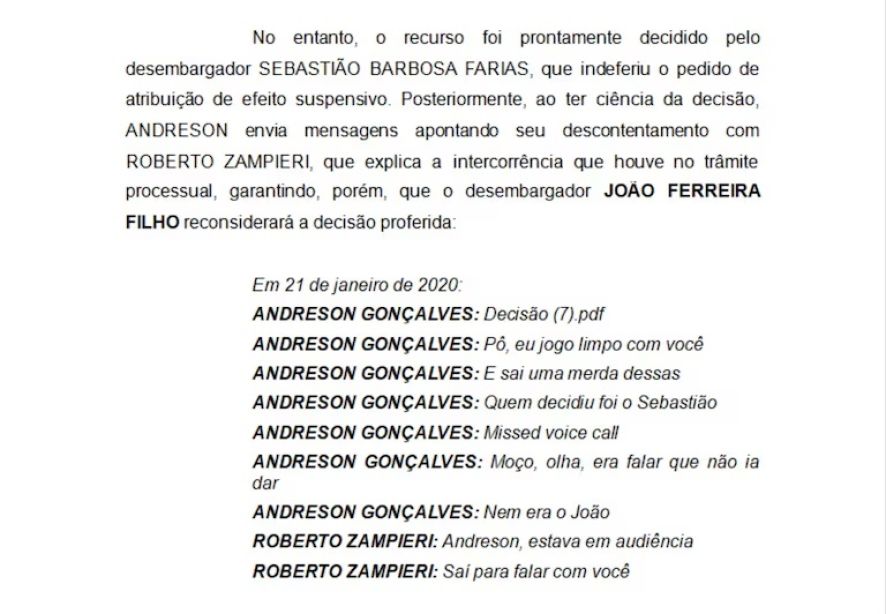O desembargador indeferiu um pedido de atribuição de efeito suspensivo, o que acabou frustrando severamente Andreson - ato contínuo, ele escreveu a Zampieri. ‘Pô, eu jogo limpo com você’ E sai uma merda dessas. Quem decidiu foi o Sebastião. Moço, olha, era falar que não ia dar. Nem era o João (Ferreira)’
