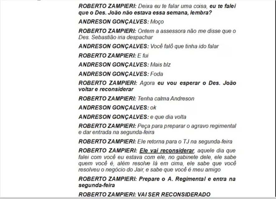 Zampieri tentou se explicar. “Andreson, deixa eu te falar uma coisa, eu te falei que o desembargador João não estava essa semana, lembra? Ontem a assessora não me disse que o desembargador Sebastião iria despachar’.