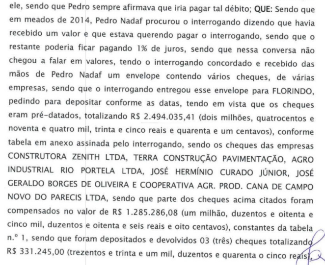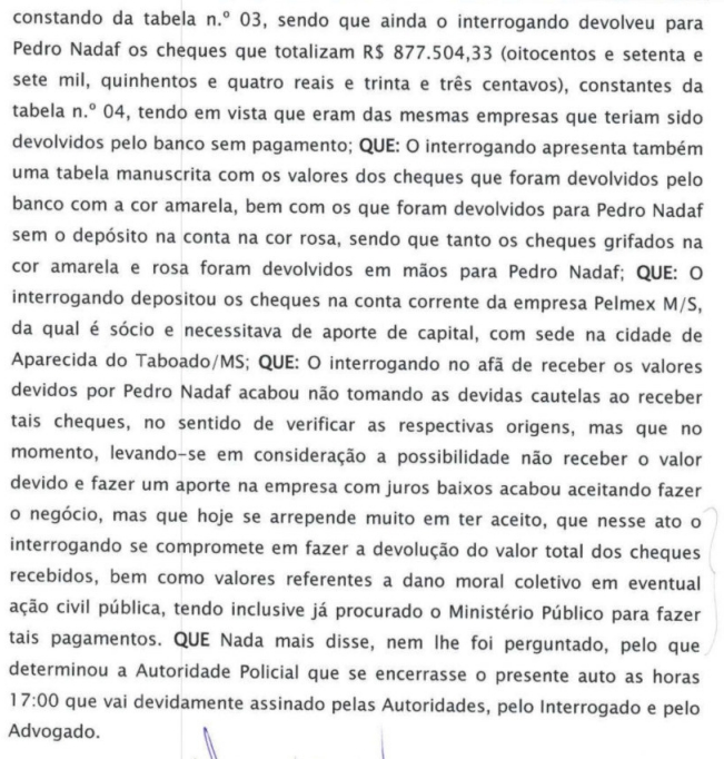 Ainda conforme o empresário, foram pagos R$ 331,2 mil e devolvidos, dos cheques, R$ 877,5 mil. De acordo com Gasques, a dívida de Nadaf com ele não tinha relação com o recebimento de benefícios do Prodeic.