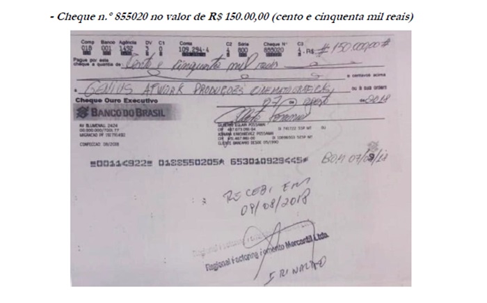 "R$ 150.000,00 (cento e cinquenta mil reais) foram pagos, no período de campanha eleitoral, à empresa Genius At Work, através da emissão do cheque do Banco do Brasil n.º 855020 em data de 07/08/2018, pós – datado para o dia 07/09/2018. O referido cheque foi emitido pelo primeiro suplente, Sr. Gilberto Eglair Possamai. Eis a gravidade da emissão: este pagamento não ocorreu por meio da conta oficial da Campanha da Candidata Juíza Selma, o que também configura violação ao §2º do art. 30-A da Lei 9.504/97", consta na ação.